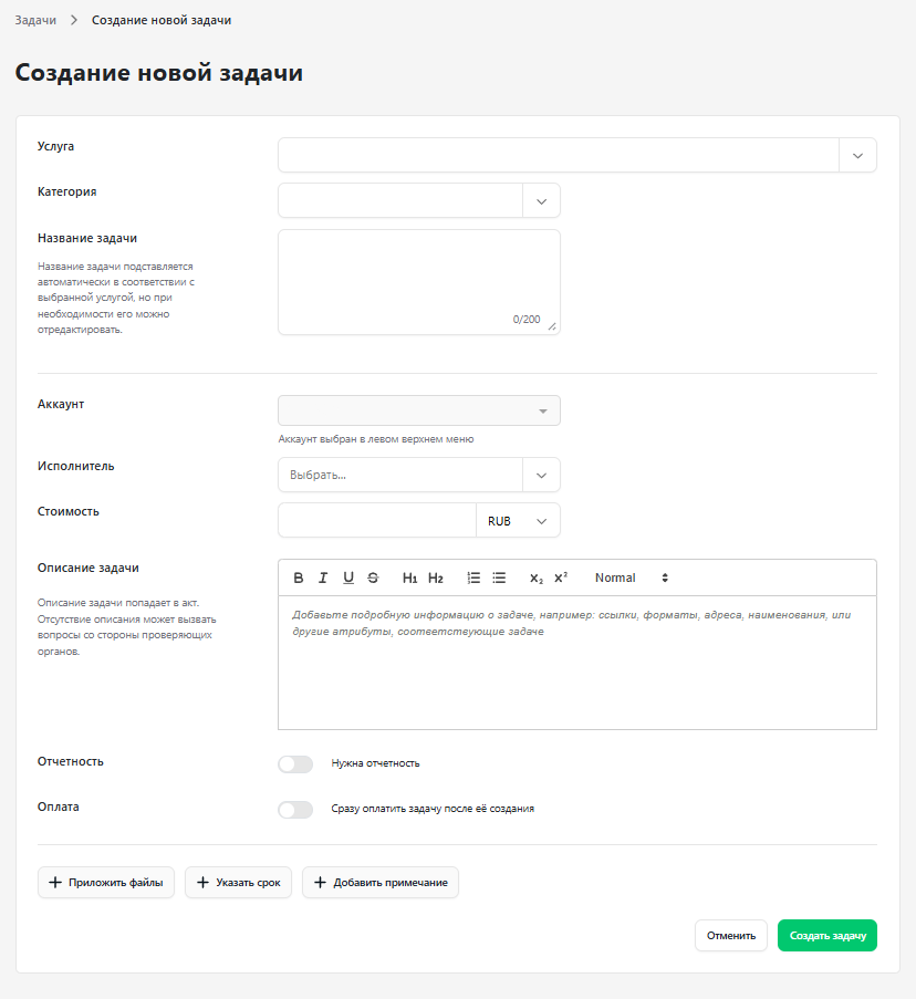 3. Откроется форма для создания задачи, которую необходимо заполнить. После этого нажмите "Создать задачу" для её размещения.