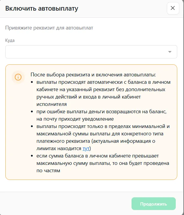 Это автоматический вывод средств с баланса исполнителя на выбранные реквизиты при достижении установленного минимального лимита для выбранного реквизита. Функция позволяет получать выплаты без ручного запроса.